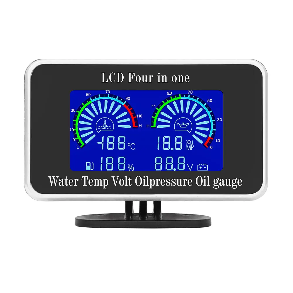 Indicatore Digitale LCD Universale 4 in 1 per Auto e Camion: Temperatura Acqua, Pressione Olio, Livello Carburante, Voltaggio con Sensore 1/8NPT M10 12V/24V