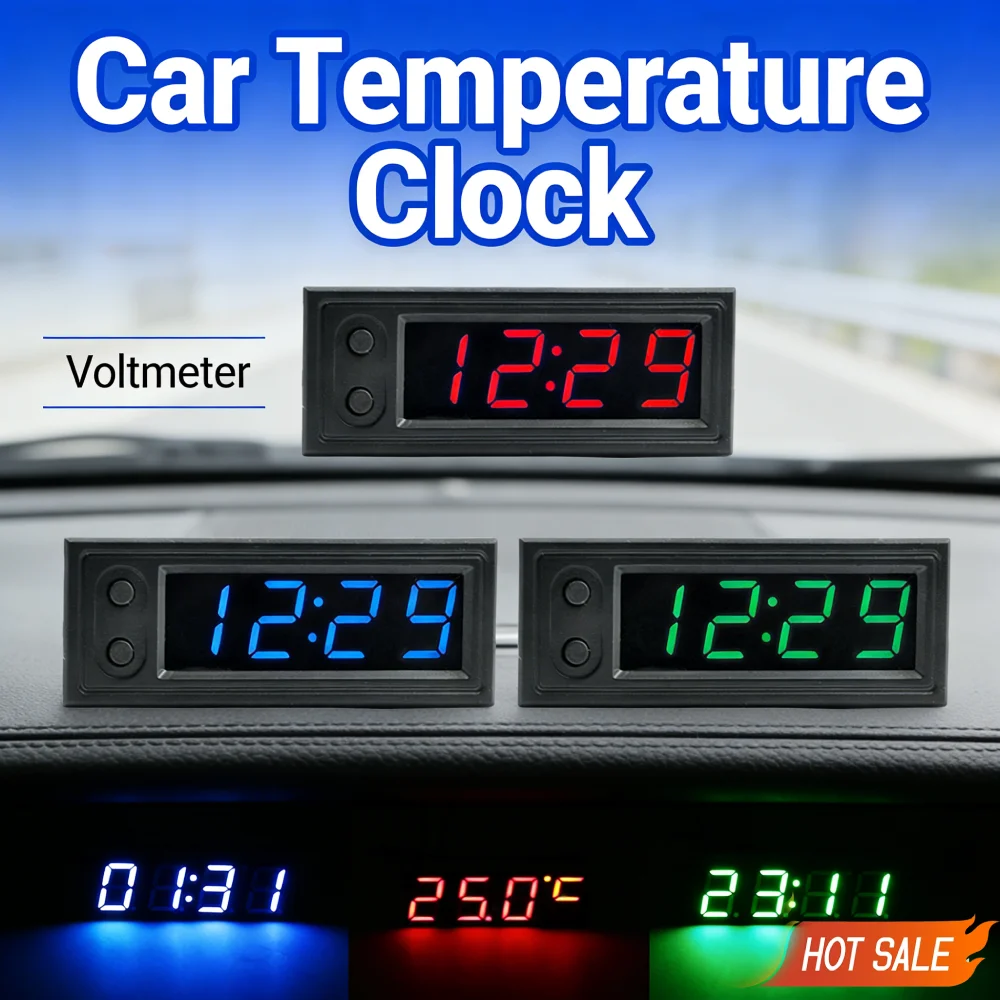 Orologio per Auto 3 in 1 con Display LED, Rilevatore di Temperatura e Voltaggio, Misuratore di Tensione Elettrica Luminoso 12V, Accessori per Automobili