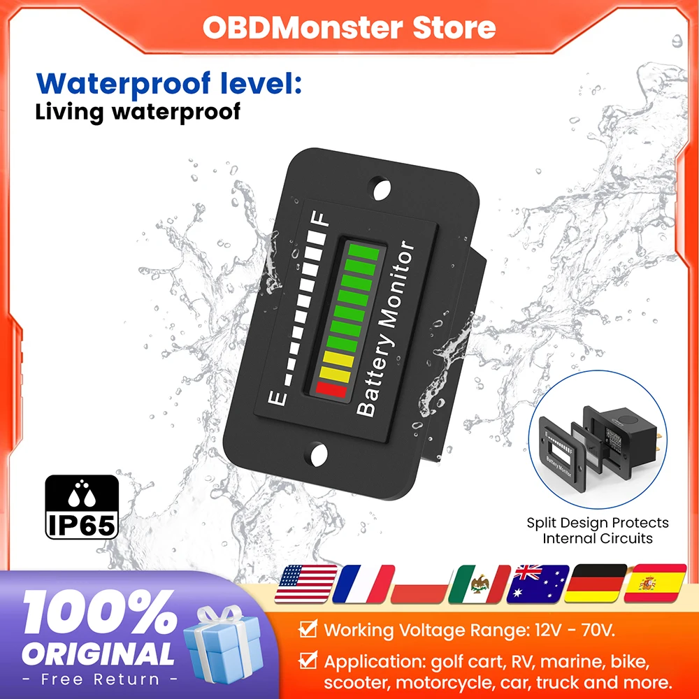Misuratore di tensione della batteria con indicatore LED 12V 24V 36V 48V 60V 72V Monitor di alimentazione della batteria impermeabile per auto Golf Cart RV Barca