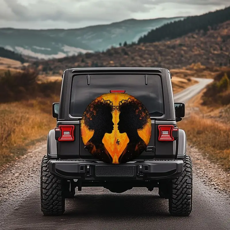 Arte simmetrica Doppia silhouette femminile sfumata arancione sfondo giallo Copertura per pneumatici in fibra di poliestere, universale per telecamera esterna