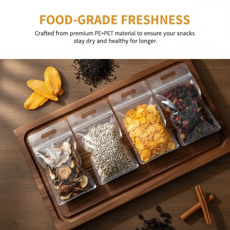 Nuove buste per imballaggio alimentare da 50 pezzi, trasparenti con manico, sigillate, per conservare caramelle e frutta secca, buste riutilizzabili con chiusura a zip