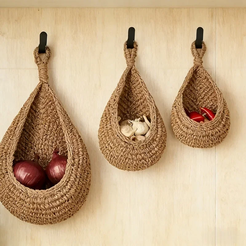 Cesti in macramè di lino, 3 pezzi, organizer da parete in stile boho, portafrutta, verdura e cipolle per cucina, casa, ristorante, decorazione.