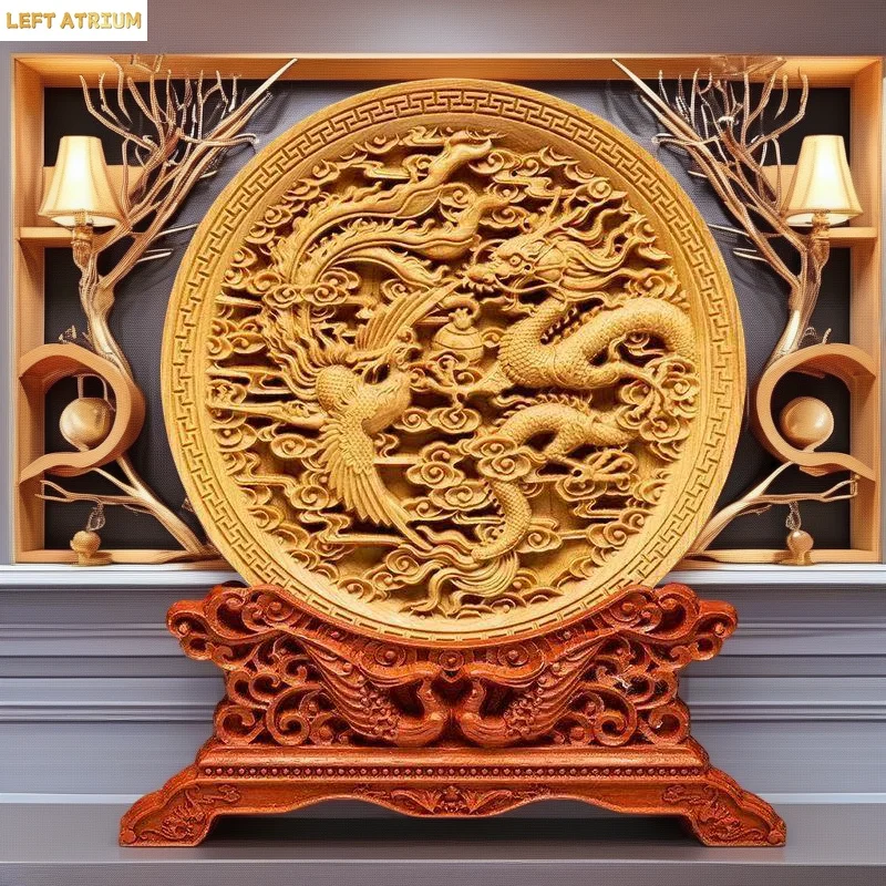 Scultura in legno con drago e fenice, statua artistica rotonda, mascotte, accessori decorativi di alta qualità per la casa, l'ufficio.