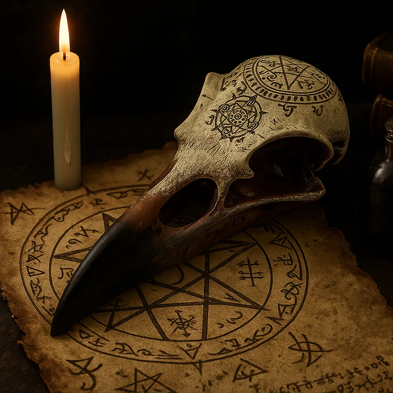 Decorazione per la Casa Gotica Scura con Rune Magiche e Teschio di Corvo in Resina. Regalo Artistico.