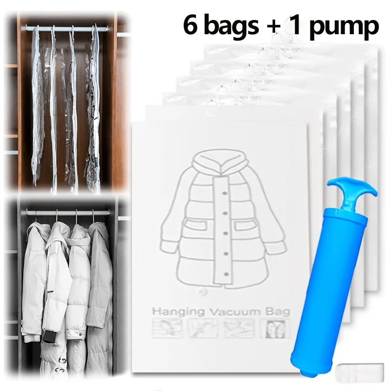 Confezione da 6 Sacchi Sottovuoto Appendibili Salvaspazio con Ganci per Vestiti, Organizzatore Riutilizzabile Antipolvere per Abiti
