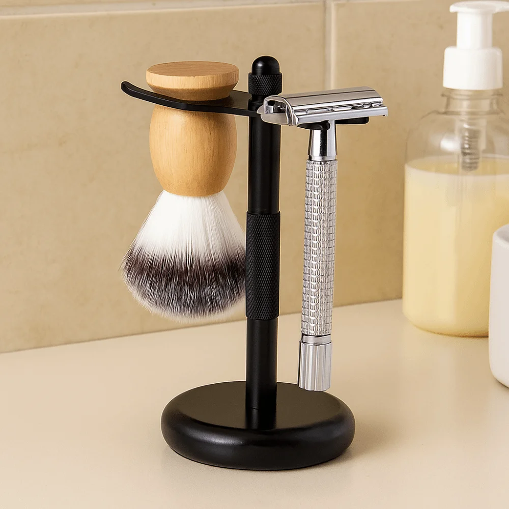 Supporto per rasoio e spazzole da costruzione in lega, finitura cromata, fondo ponderato, supporto per pennelli da barba, aperture extra larghe, sicurezza