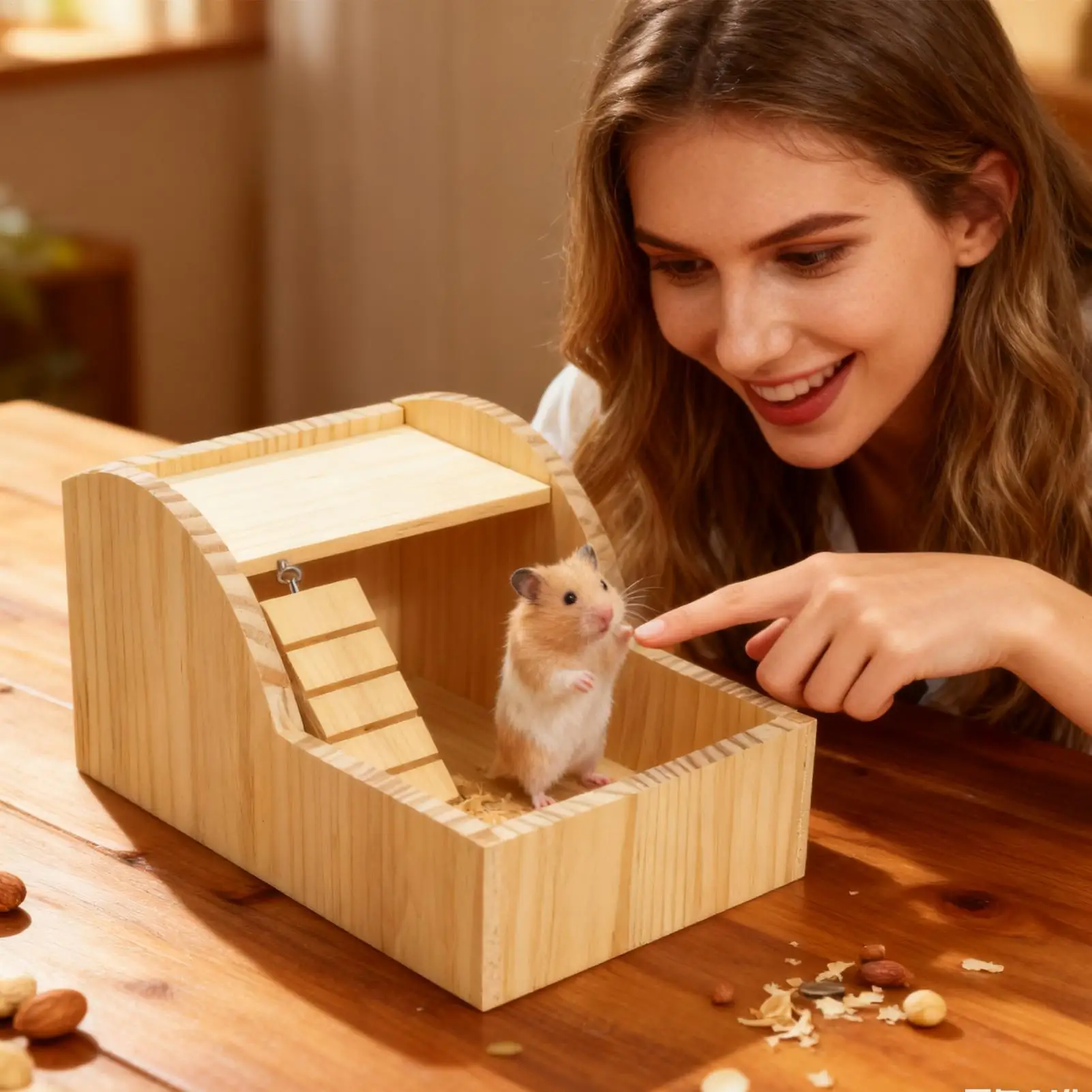 Scatola di sabbia per criceti in legno con scaletta Contenitore per vasca da bagno per criceti per arricchimento Cura degli animali Comfort Gabbia per la casa Stile di vita Beneficio