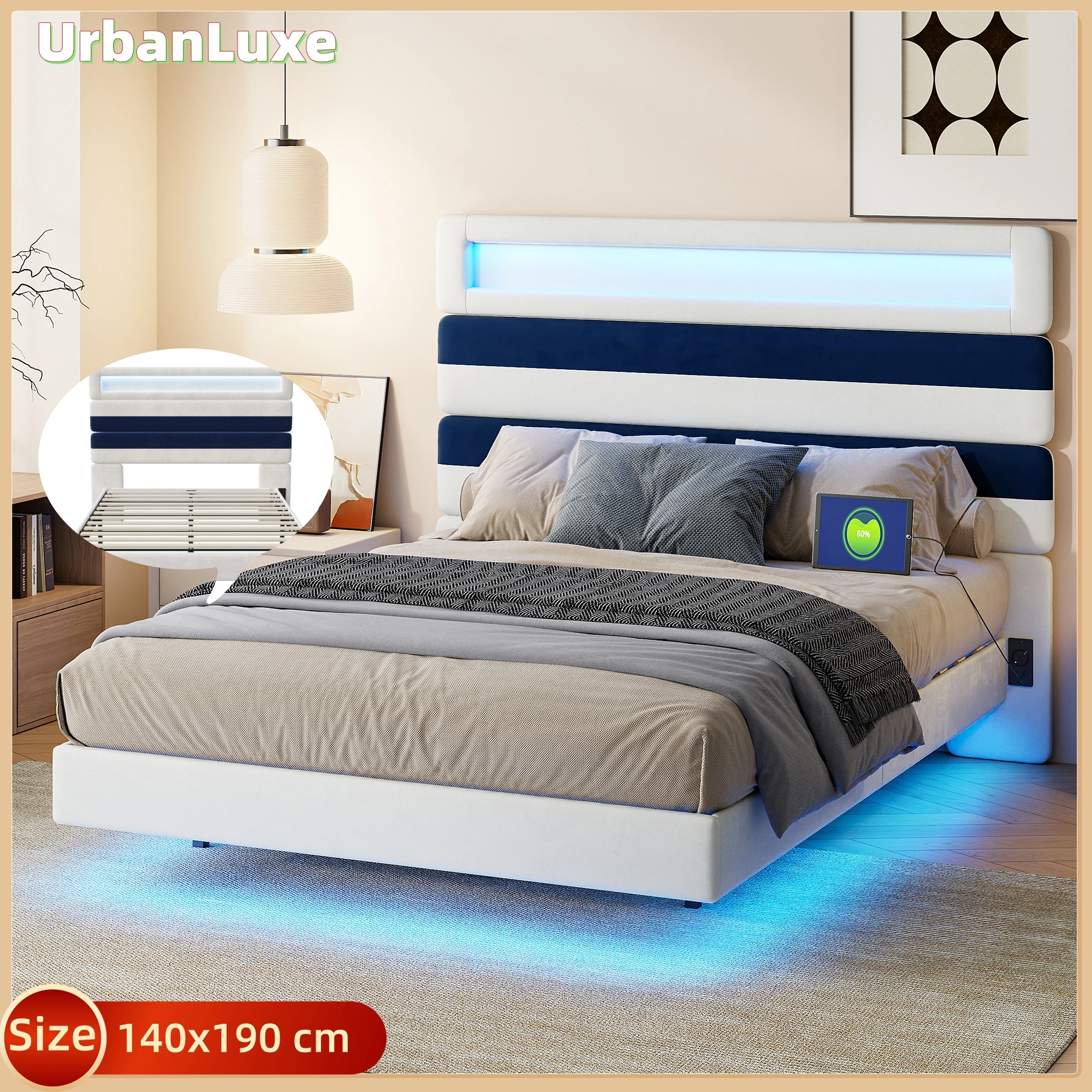 UrbanLuxe Letto 140x190 cm con rete a doghe, striscia luminosa a LED e doppia porta di ricarica USB, letto imbottito, velluto, bianco sporco + blu