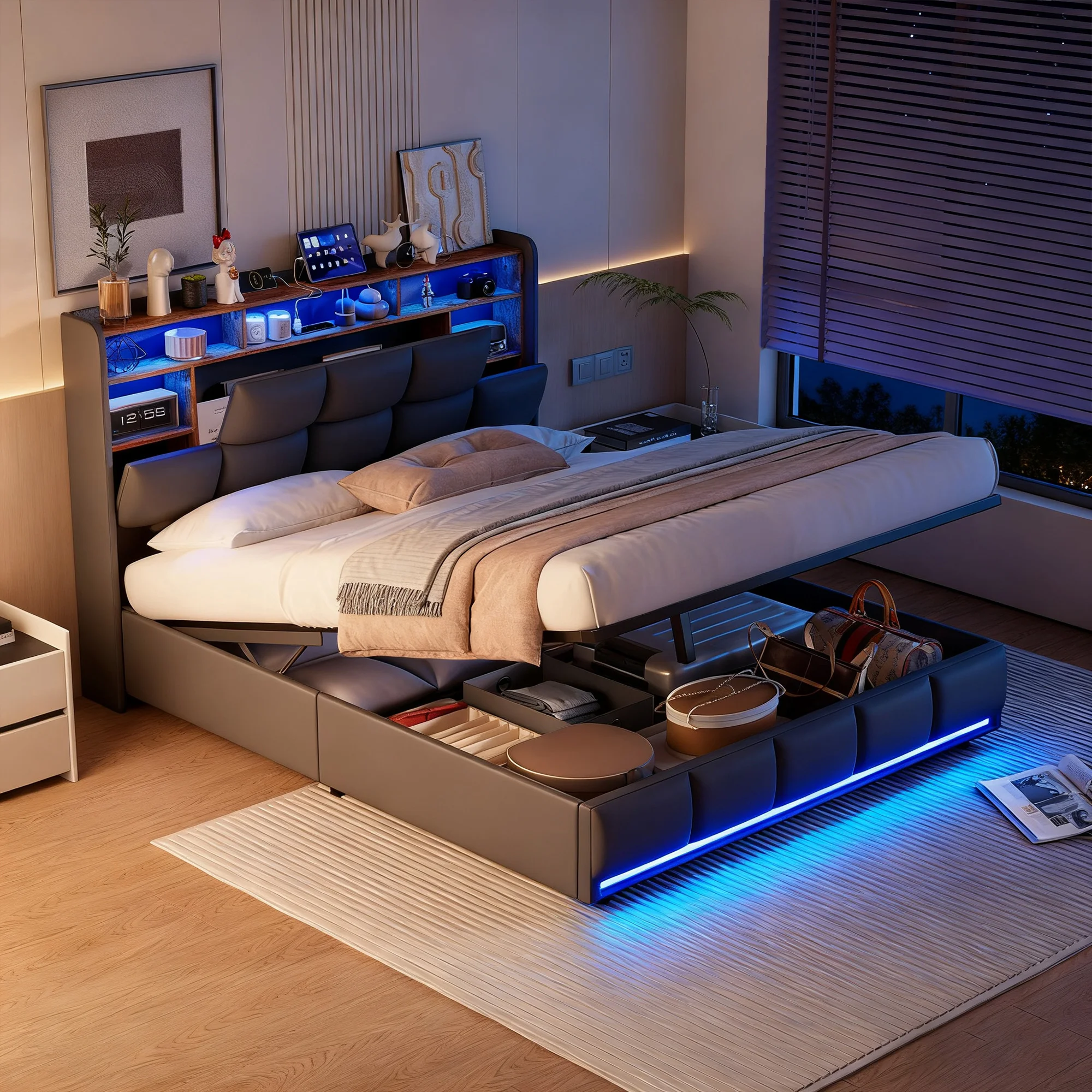 LVHOM Struttura letto moderna con testiera ampia, luci a LED, porte USB, sistema di sollevamento idraulico e ampio spazio di archiviazione sotto il letto