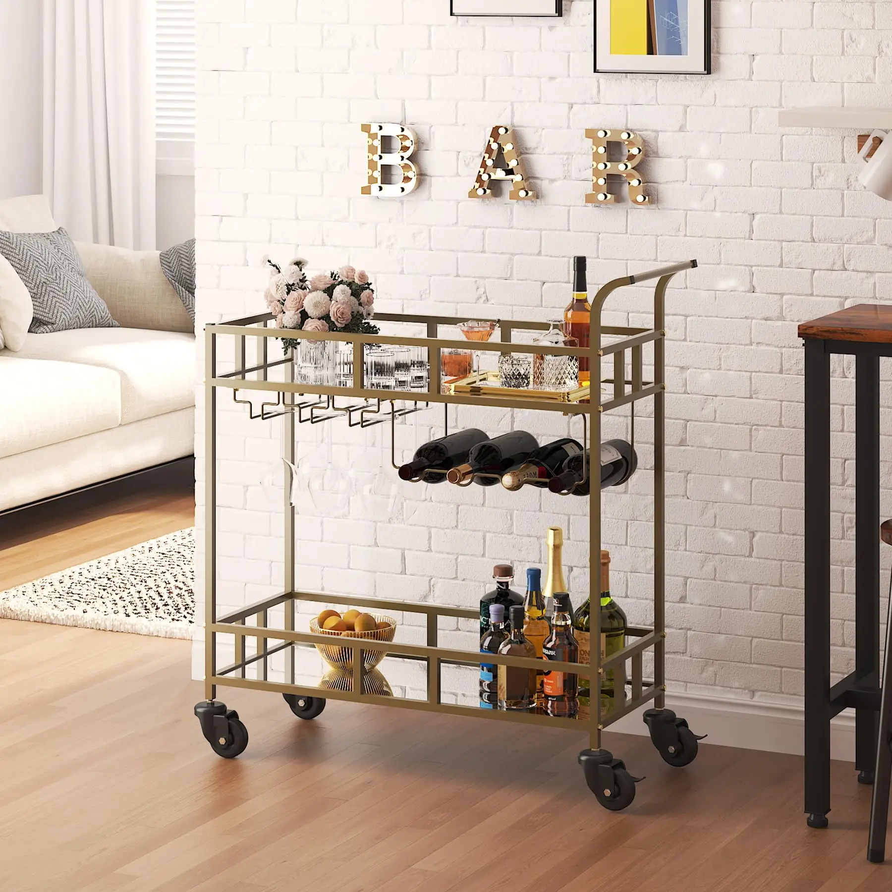 Carrello Bar a 2 Ripiani con Ruote per Casa, Piccolo Carrello con Mensole a Specchio, Portabottiglie e Portabicchieri per Sala da Pranzo, Soggiorno e Feste