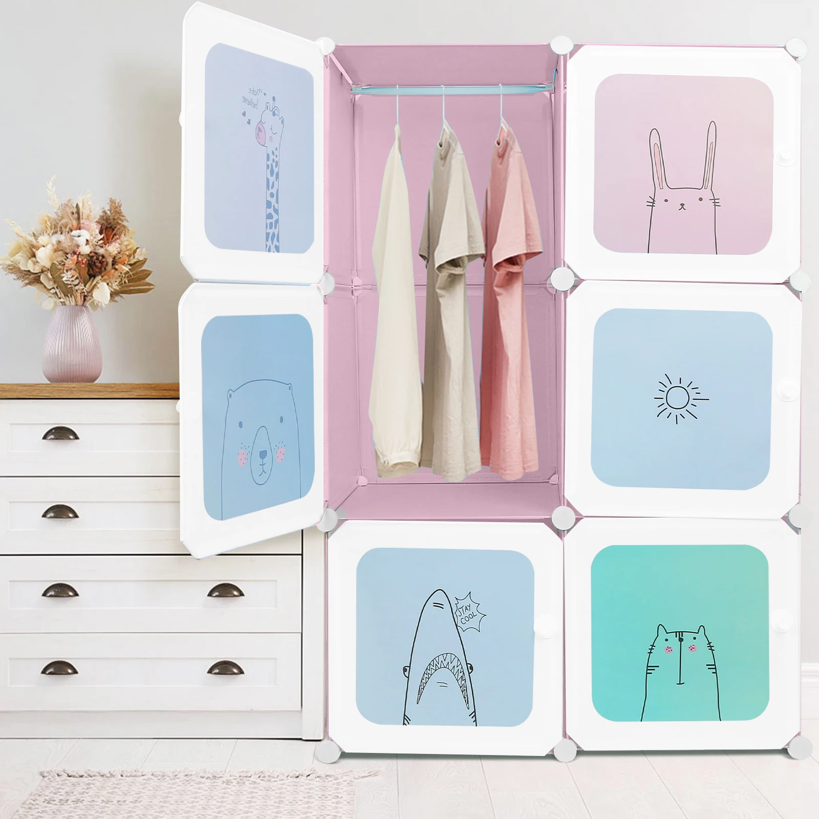 Armadio per cameretta bambini, unità di archiviazione per bambini con 6 cubi e 1 sezione appendiabiti, armadio modulare, 74 x 37 x 110 cm