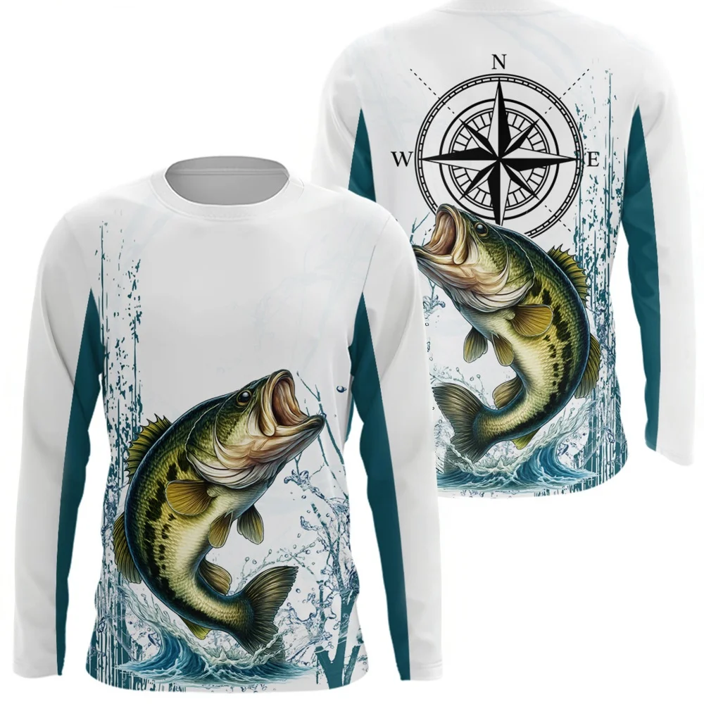 Maglia da Pesca con Design Bussola, Stampa a Blocchi di Colore Blu-Bianco, Top da Pesca a Girocollo a Maniche Lunghe, Comoda e alla Moda