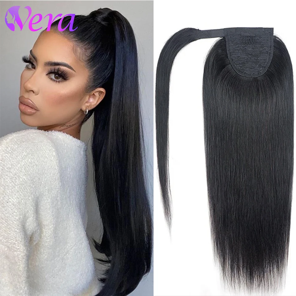 Coda di cavallo lunga e diritta con coulisse, 100% capelli umani vergini, con clip avvolgente, colore naturale 1B, per donna