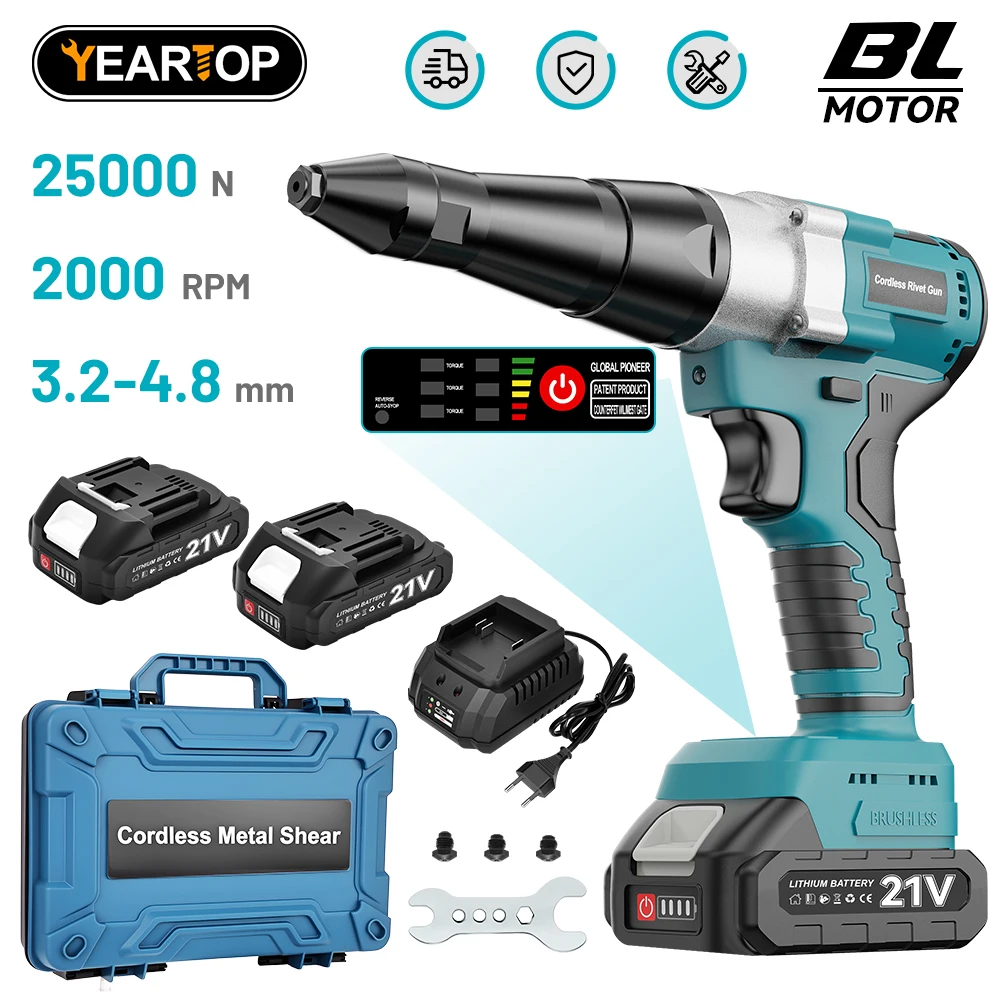 YEARTOP 25000N Pistola per rivetti elettrica senza spazzole Cordless 3.2-4.8mm Pistola per dadi per rivetti Inserto per trapano Utensile elettrico automatico per batteria Makita 18V