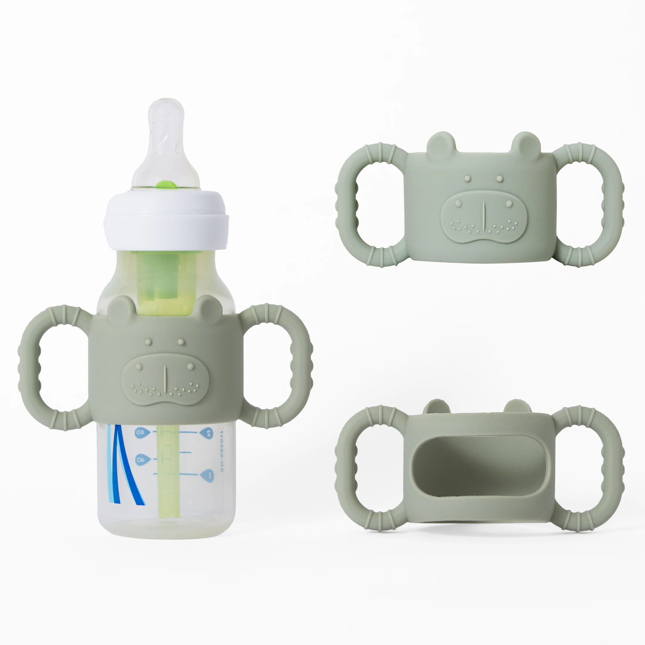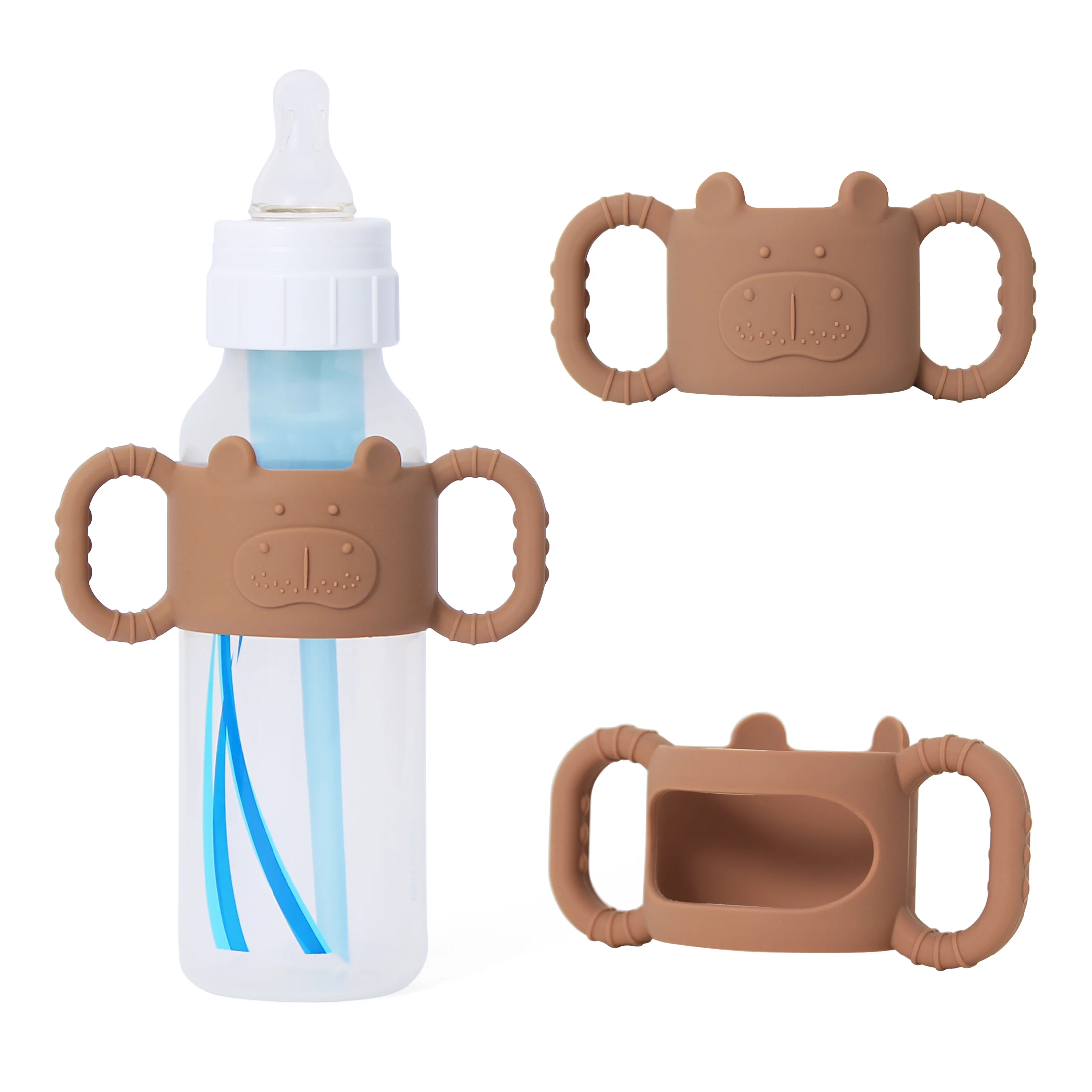 1 maniglia per biberon in silicone, per biberon a ventosa stretta di Brown, grazioso design a forma di ippopotamo e robusto supporto per biberon in silicone (rosa)