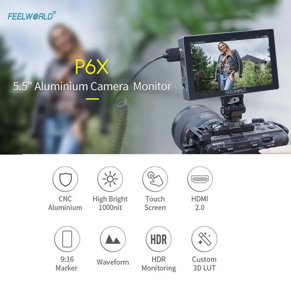 FEELWORLD P6X Monitor da Campo per Fotocamera DSLR da 5,5 Pollici in Alluminio, Pannello IPS 3D LUT HDR, Schermo Touch, 4K HDMI, Alta Luminosità 1000nit