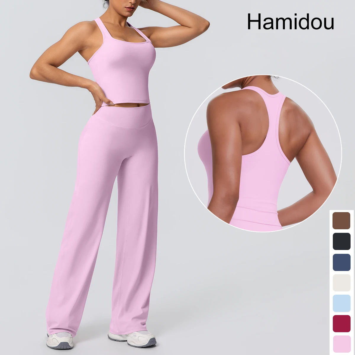 Set da 2 pezzi per donna Top da allenamento in tinta unita ad asciugatura rapida Gilet a forma di I Vita alta Glutei color pesca Pantaloni a gamba larga Tuta da yoga