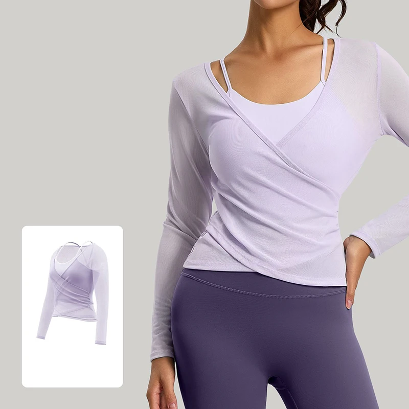 Completo Yoga da Donna 2 Pezzi: Top a Maniche Lunghe in Rete con Spalline e Imbottiture, Asciugatura Rapida, Traspirante, Vestibilità Slim, Copricostume Sportivo