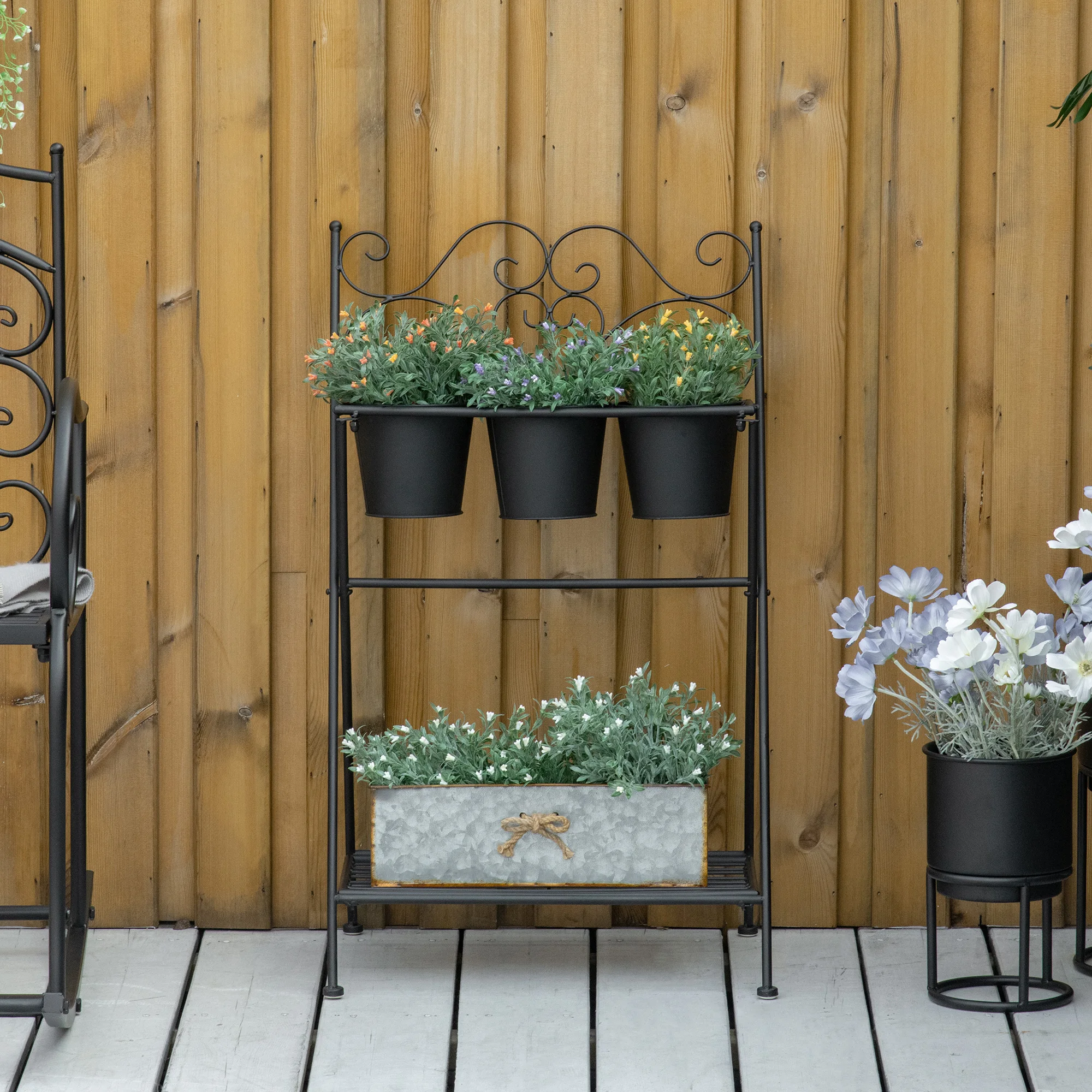 Outsunny Portapiante Scaffale in Metallo Pieghevole, Set Vasi per Piante con Ripiano per Casa e Giardino, 47x37x78.5cm, Nero