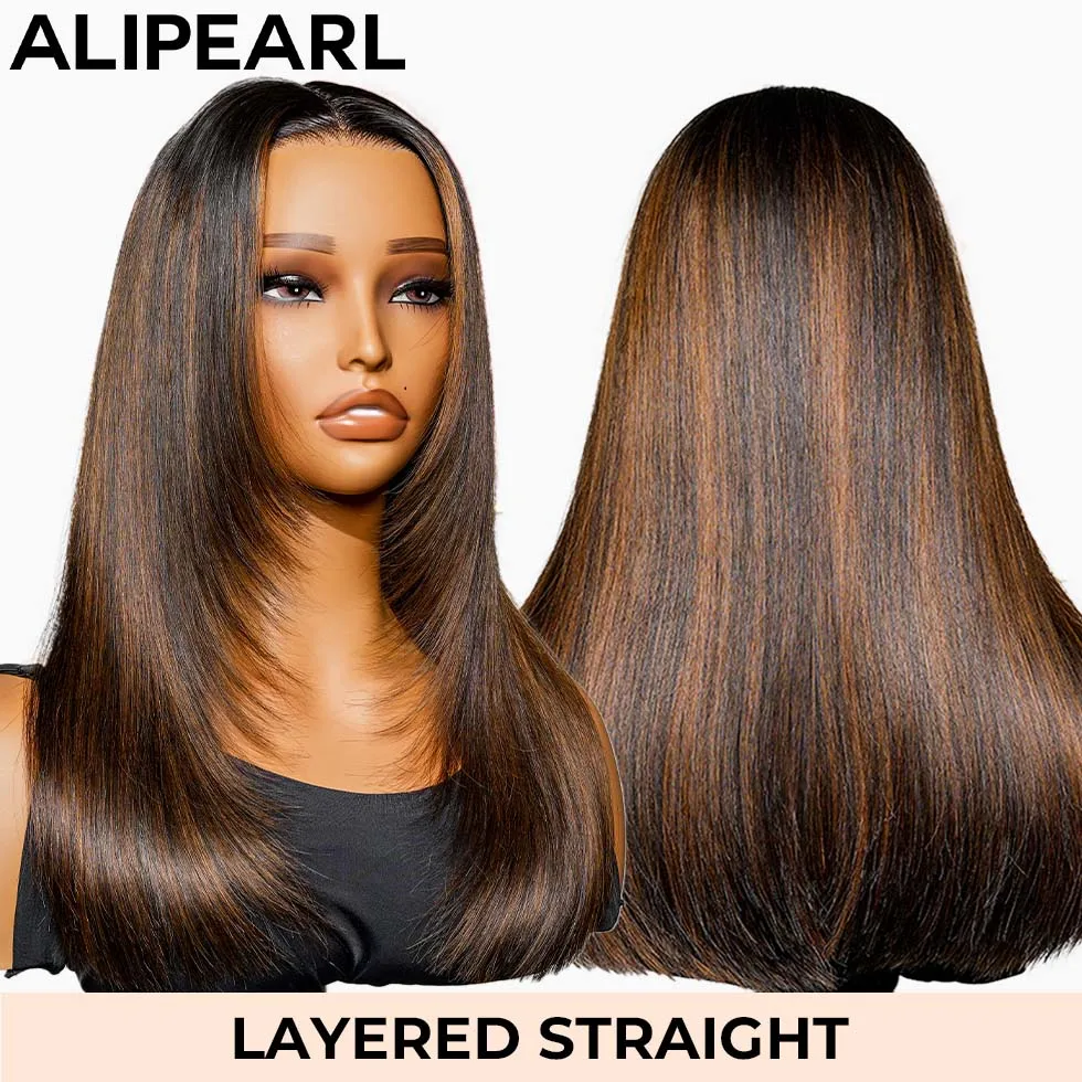 Parrucca in pizzo 4x4 pre-tagliata senza colla con frangia a tendina, pronta da indossare, in capelli umani, a strati, densità 250%