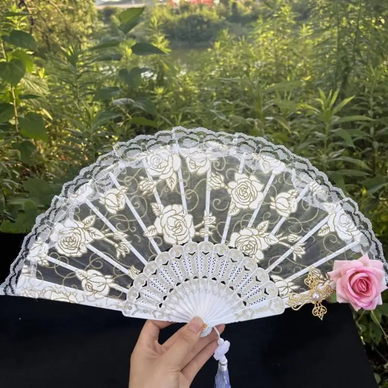 Ventagli in bambù vintage con rose nere, bianche e rosse, per cosplay, feste di Halloween, oggetti di scena fotografici, ventaglio a mano in pizzo da donna, ventaglio gotico Lolita, ventaglio vittoriano