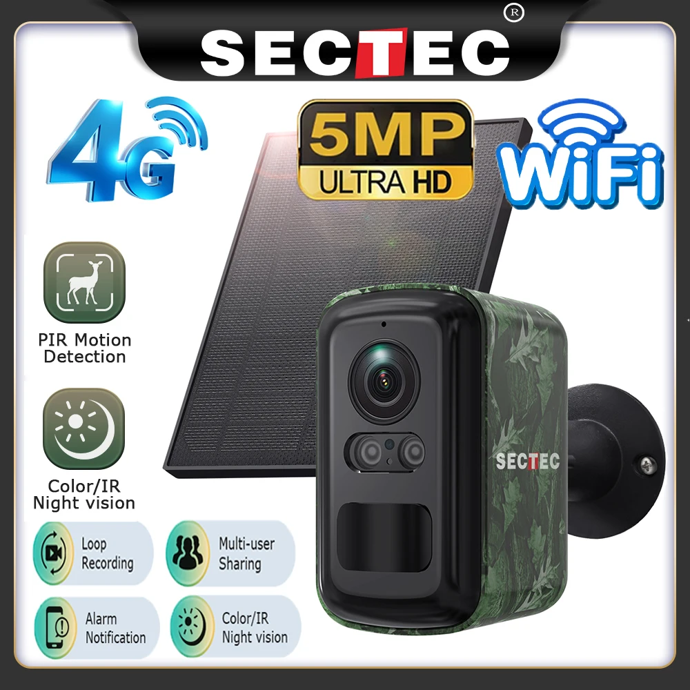 Telecamera Solare 4G Mini Sectec 5MP per Esterni, Telecamera di Sicurezza WiFi Mimetica con Rilevamento PIR, Tracciamento Automatico, App UBox