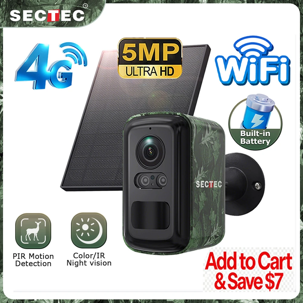 Telecamera Solare 4G Mini Sectec 5MP per Esterni, Telecamera di Sicurezza WiFi Mimetica con Rilevamento PIR, Tracciamento Automatico, App UBox