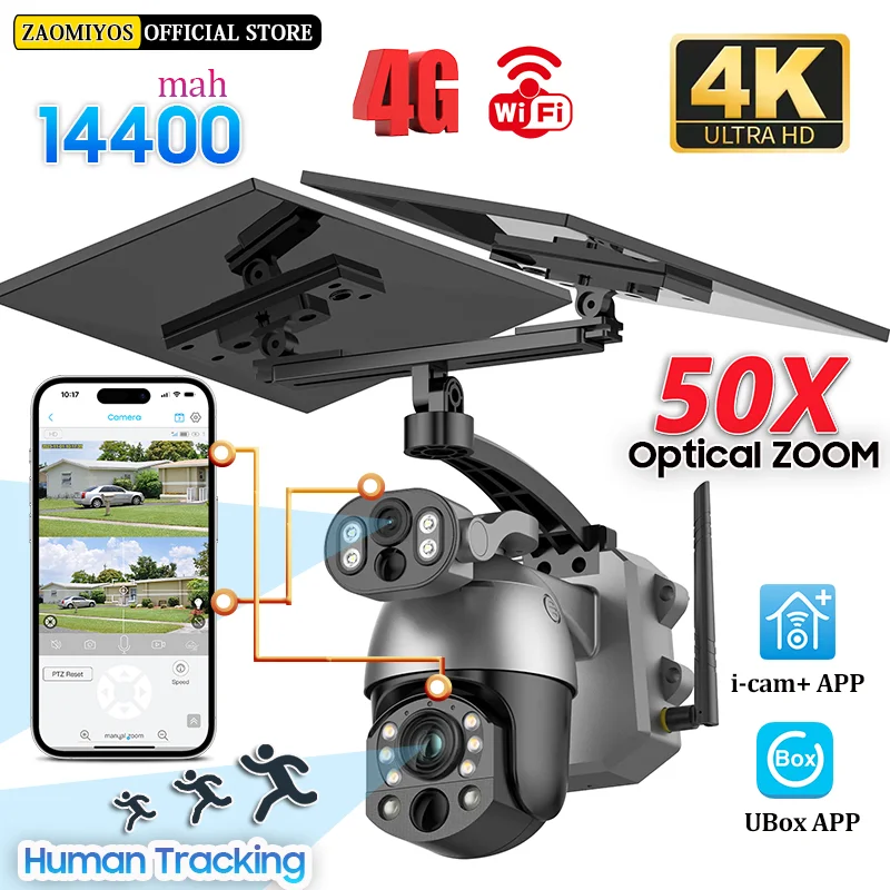 Telecamera solare 4K 50X ZOOM 10MP 4G SIM 360 ° Telecamera IP CCTV di sicurezza con batteria WIFI per visione notturna PIR con tracciamento umano a doppia lente per esterni