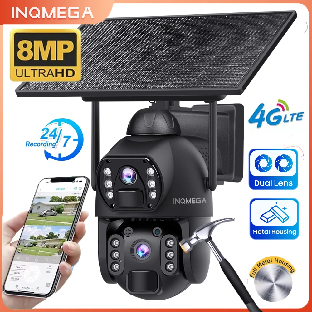 INQMEGA AOV Telecamera Solare 4G con Registrazione 24/7, Telecamera WiFi Wireless 8MP, Monitoraggio Automatico, Scocca in Metallo, Pannello Solare 10W + UBOX PRO 20100mAh