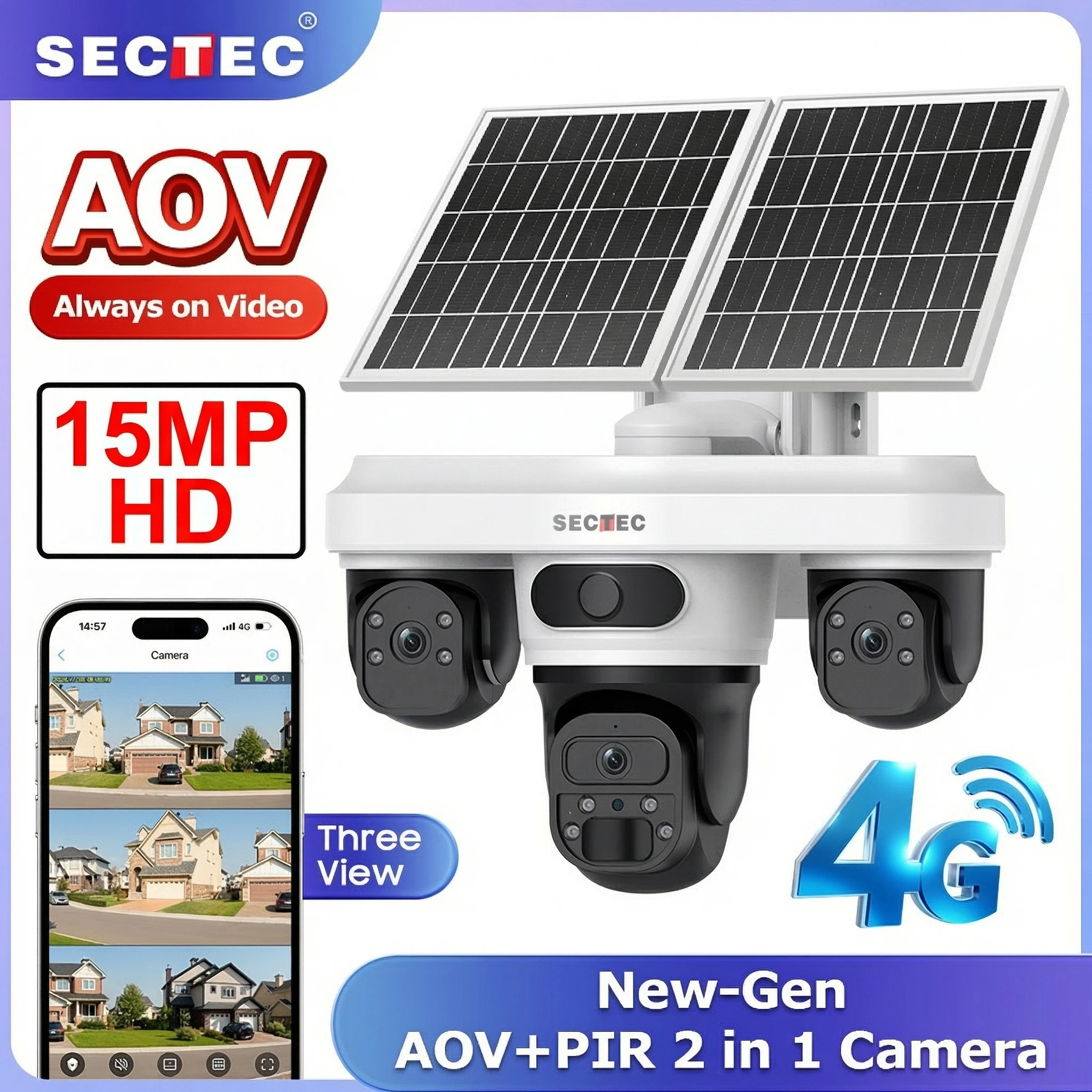 Telecamera di Sicurezza Solare 4G SECTEC con 3 Obiettivi, 15MP, WiFi Wireless, Registrazione 24/7, Apertura F1.0, Rilevamento AI Umano 90FT, IP66