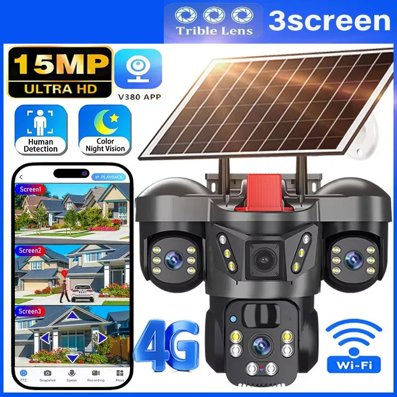 15MP 4G Sim Telecamera solare di sorveglianza WiFi esterna CCTV wireless 3 lenti 3 schermi PIR Visione notturna Telecamera di sicurezza con tracciamento automatico
