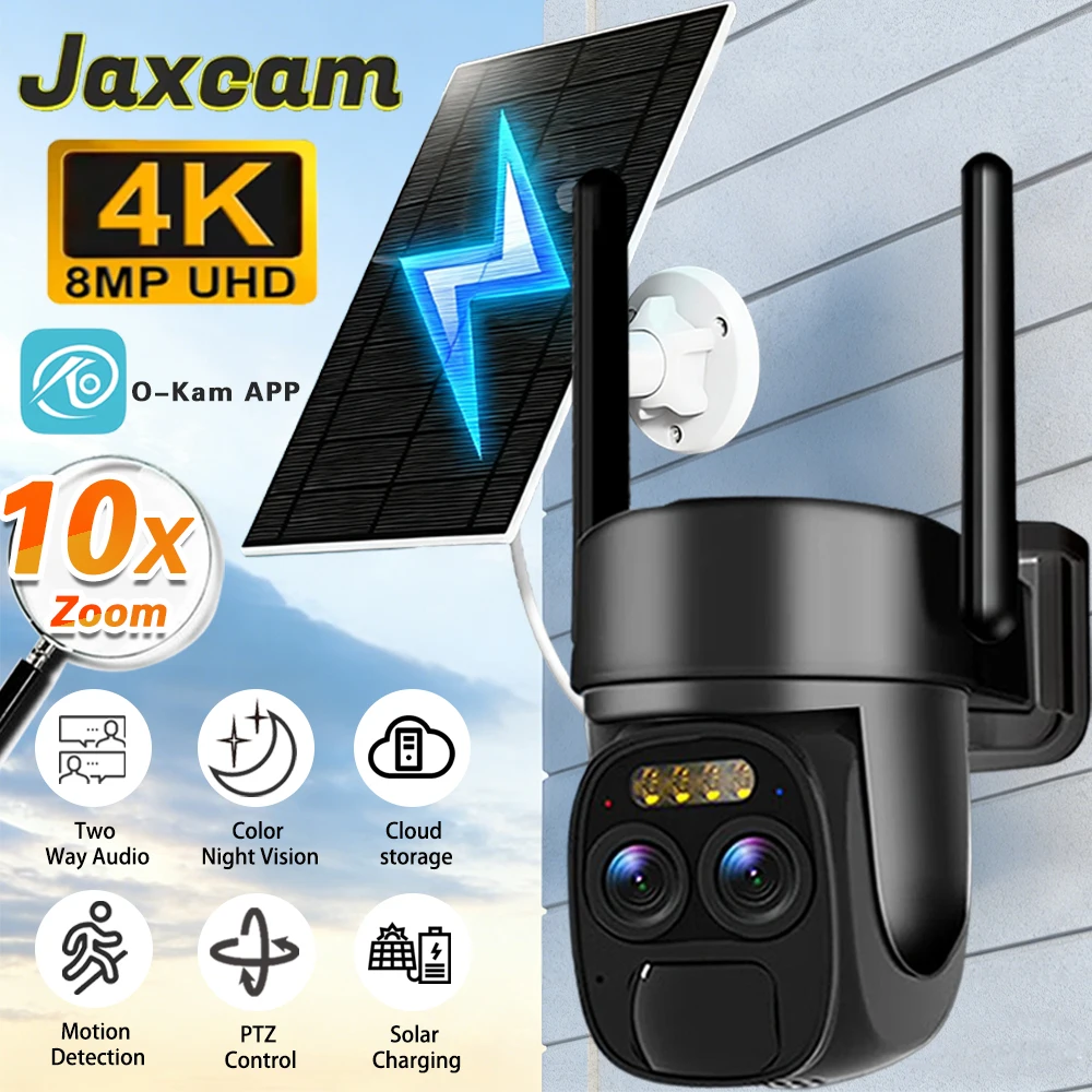 Telecamere Solari WIFI a Doppia Lente 8MP con Zoom 10X, Telecamera PTZ Wireless a Batteria, Visione Notturna a Colori 4K, Audio Bidirezionale O-KAM A