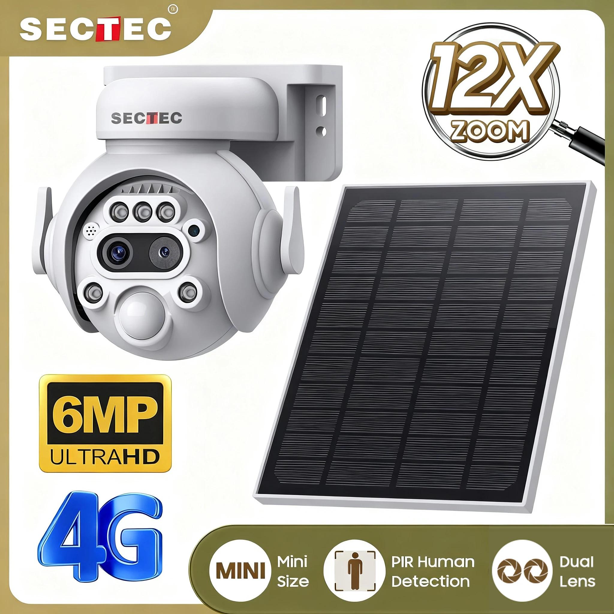 Sectec 6K 12MP 15X ZOOM Telecamera solare 4G SIM /WIFI Registrazione a tre obiettivi Doppio schermo Monitoraggio automatico umano Visione notturna a colori UBox