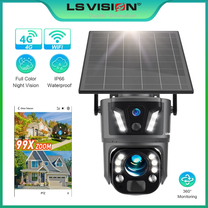 Telecamera di Sicurezza LS VISION 99X Zoom WIFI per Esterni, Wireless 4G, Tripla Lente con Zoom 99X, Rilevamento Umano PIR, Alimentazione Solare per Fattorie e Ville