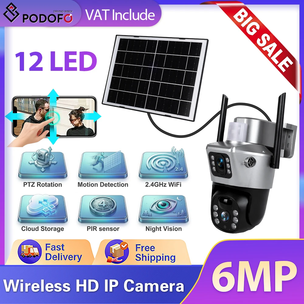 Podofo V380PRO Telecamera Solare Wireless HD 6MP, Telecamera di Sicurezza WiFi 4K, Telecamera IP Alimentata a Energia Solare con Rilevamento PIR