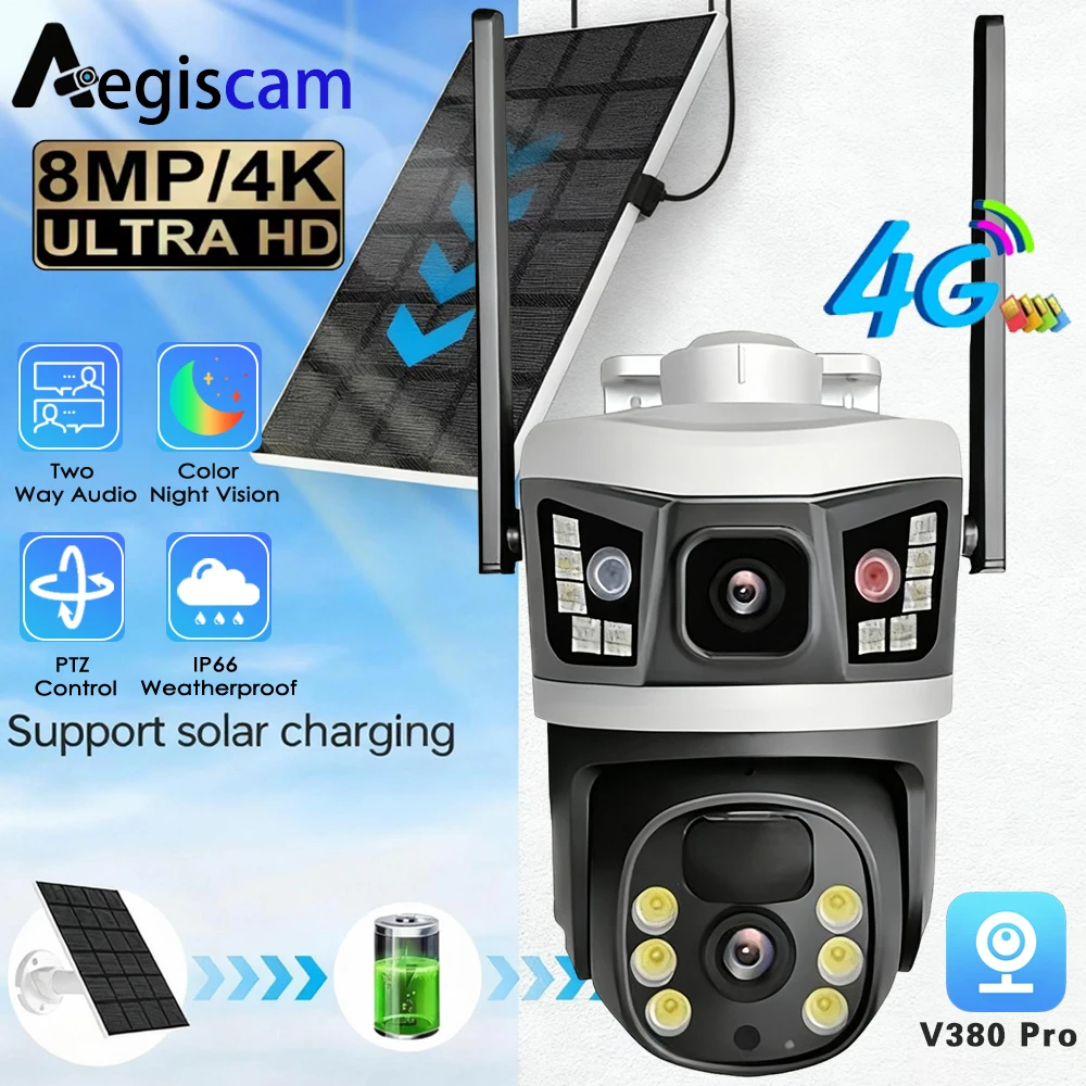 Telecamera solare 4G con scheda SIM 8MP 4K Doppia lente Monitor a doppio schermo Visione notturna Protezione di sicurezza Video sorveglianza PTZ