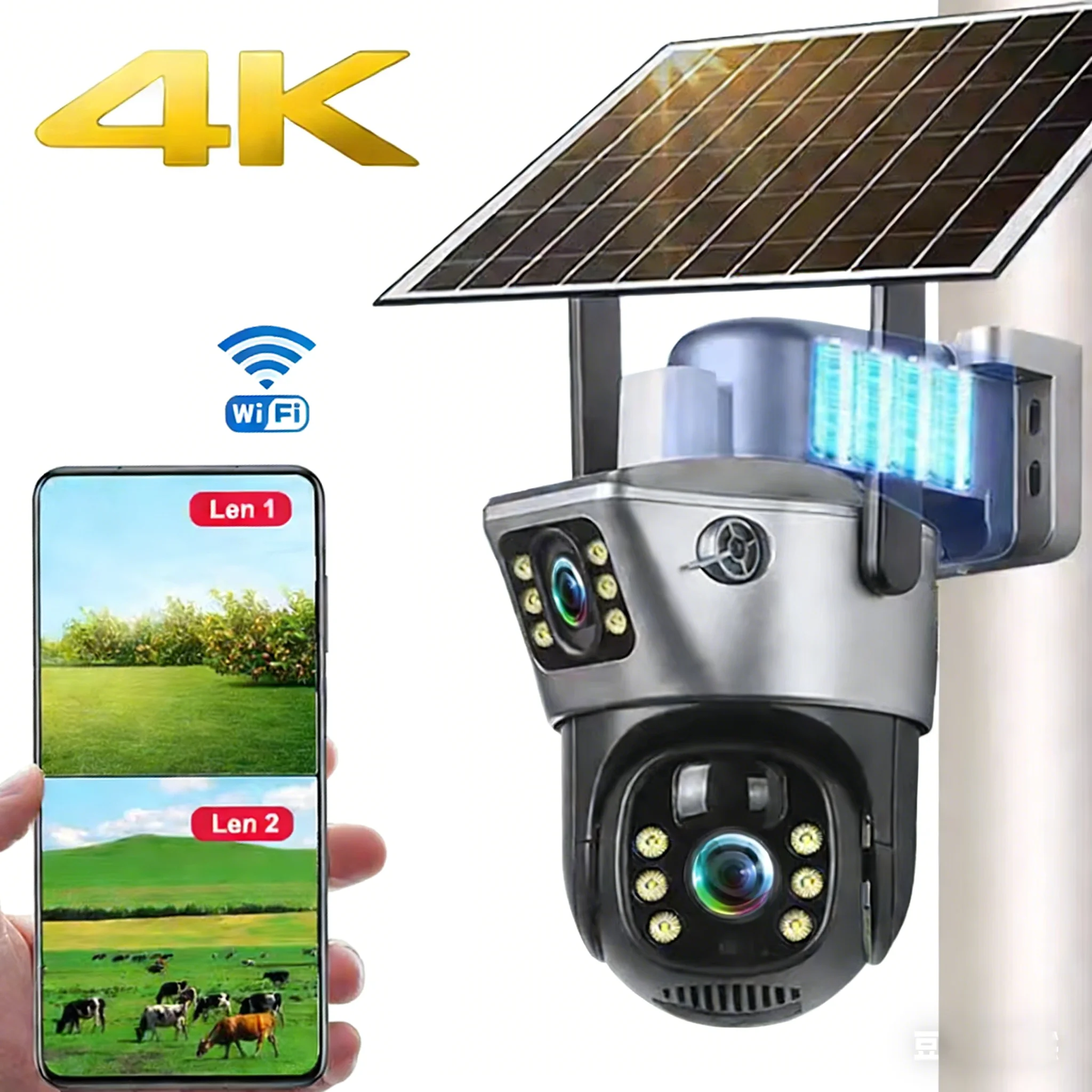 Telecamera Solare WiFi con Doppia Lente, 8MP 4K, Basso Consumo, Visione Notturna PIR, IP66, per Esterni