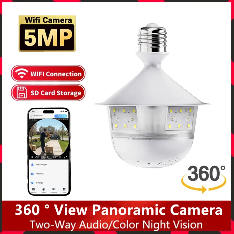 Telecamera di Sicurezza IP CCTV 5MP Wifi a 360° Panoramica Fisheye per Interni, Visione Notturna a Colori, Audio Bidirezionale, Tracciamento Automatico Wireless