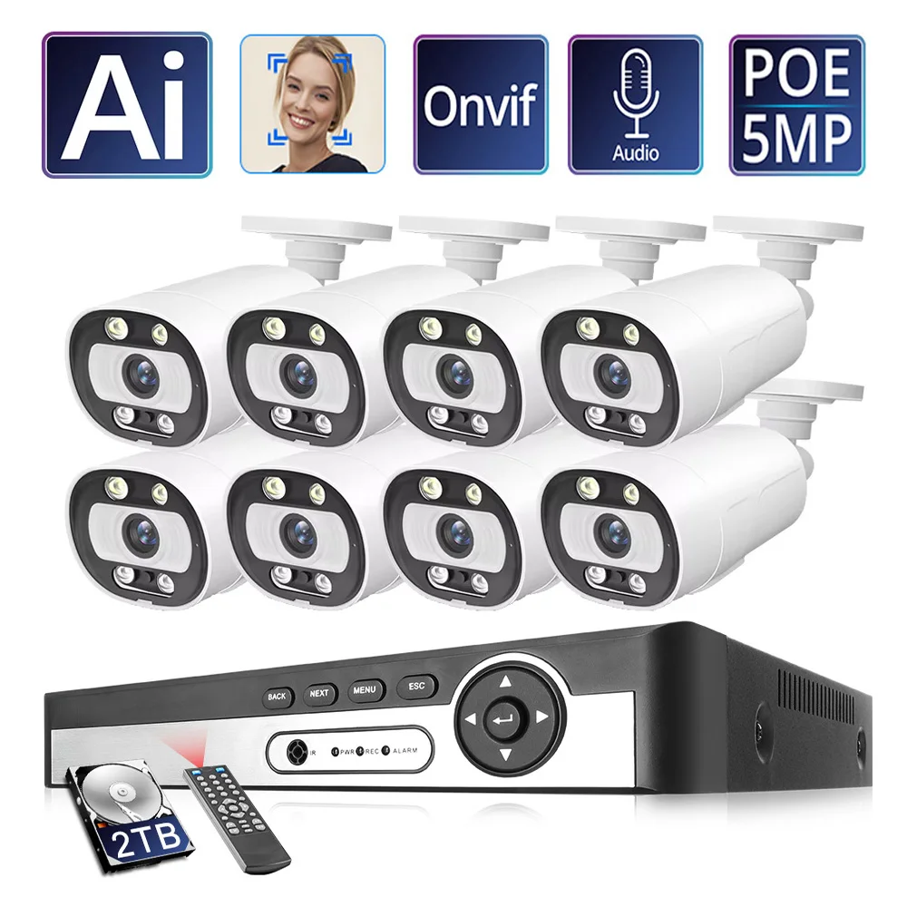 Sistema di Sicurezza con Telecamere POE H.265 8CH 4K 5MP per Esterni, Rilevamento Umano 8MP, Sorveglianza CCTV, Protezione, Visione Notturna a Colori, P2P