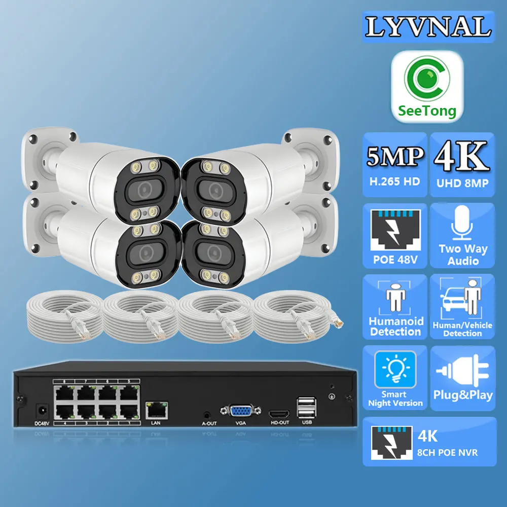 Seetong APP Sistema di telecamere IP di sicurezza esterna 4K 8MP Kit NVR POE 4K HD 8CH Audio bidirezionale Set di telecamere IP di videosorveglianza da 5MP