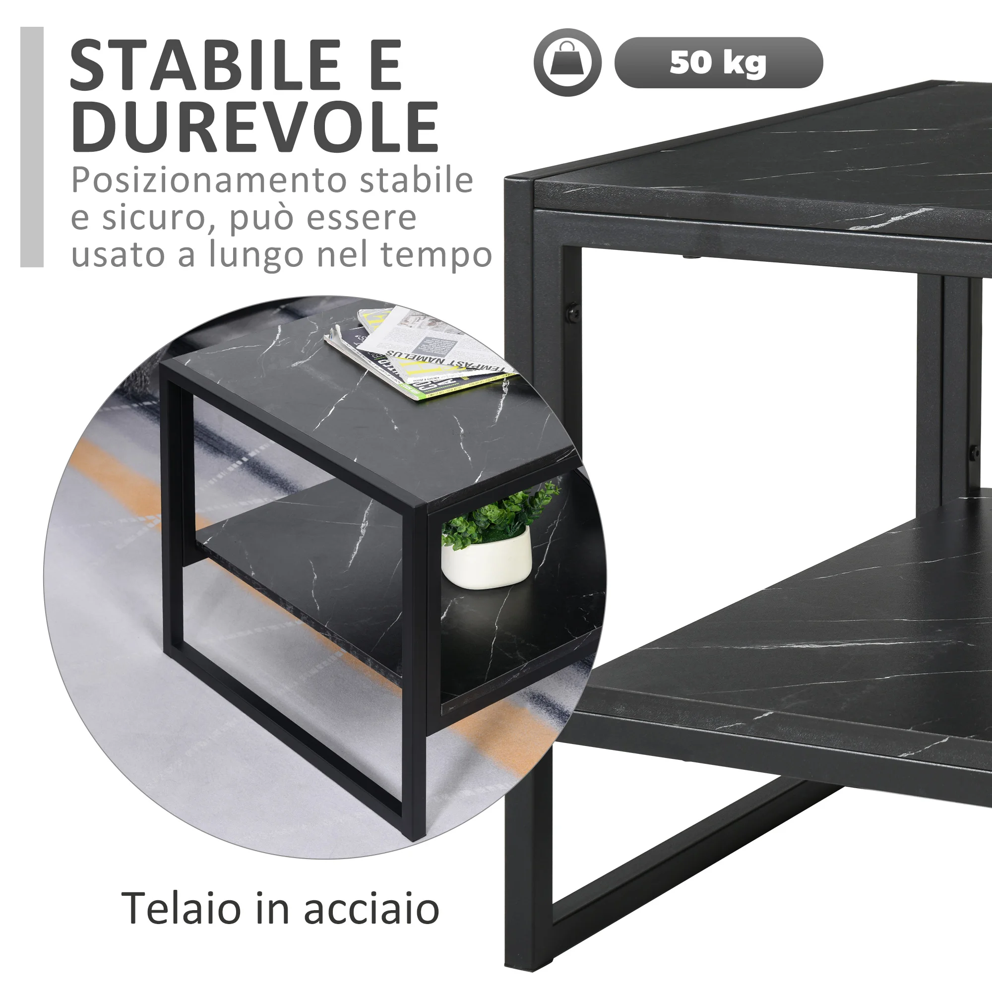 Tavolino da caffè, tavolino a doppio livello effetto marmo sintetico con struttura in metallo e vano portaoggetti per soggiorno, 106x50x45 cm, Nero
