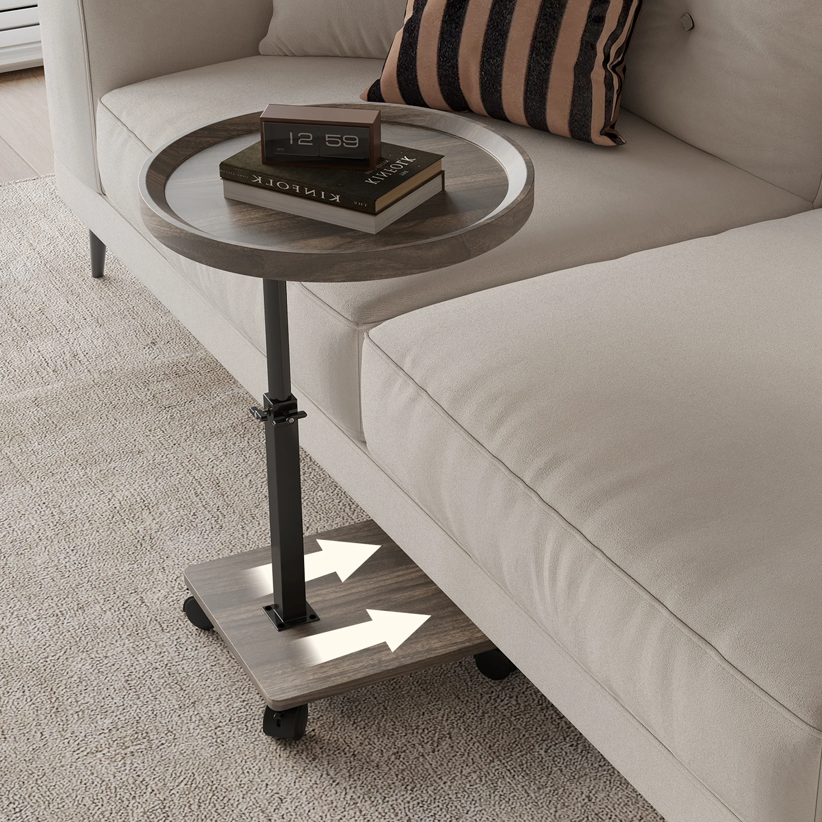 Tavolino da Caffè con 4 Ruote, Altezza Regolabile, Girevole, Montaggio a Pavimento, Tavolino Rotondo in Legno Salvaspazio