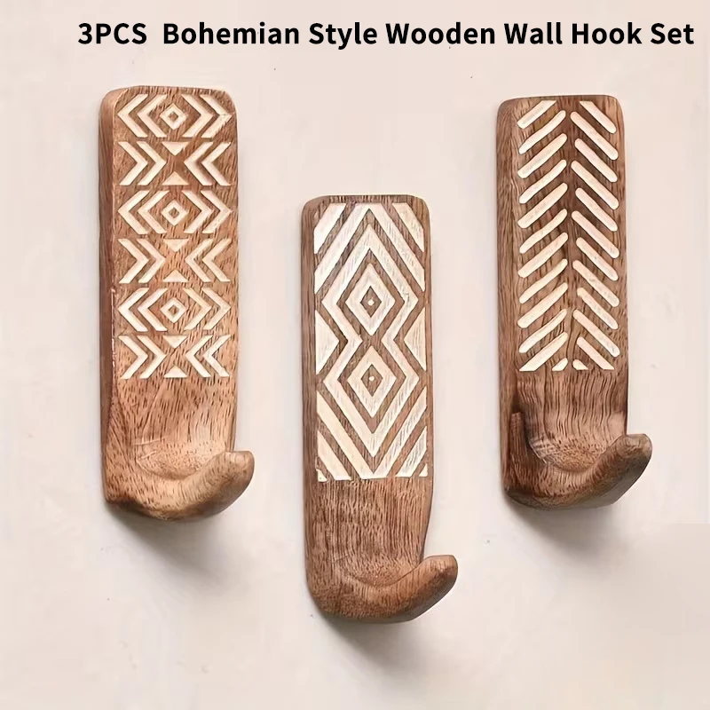 Ganci per vestiti, set di ganci da parete in legno stile bohémien da 3 pezzi, resistenti alla ruggine, facili da installare, perfetti per il bagno e la decorazione della casa.