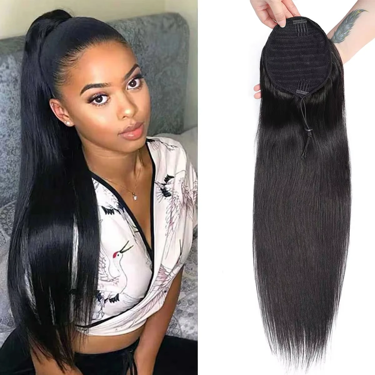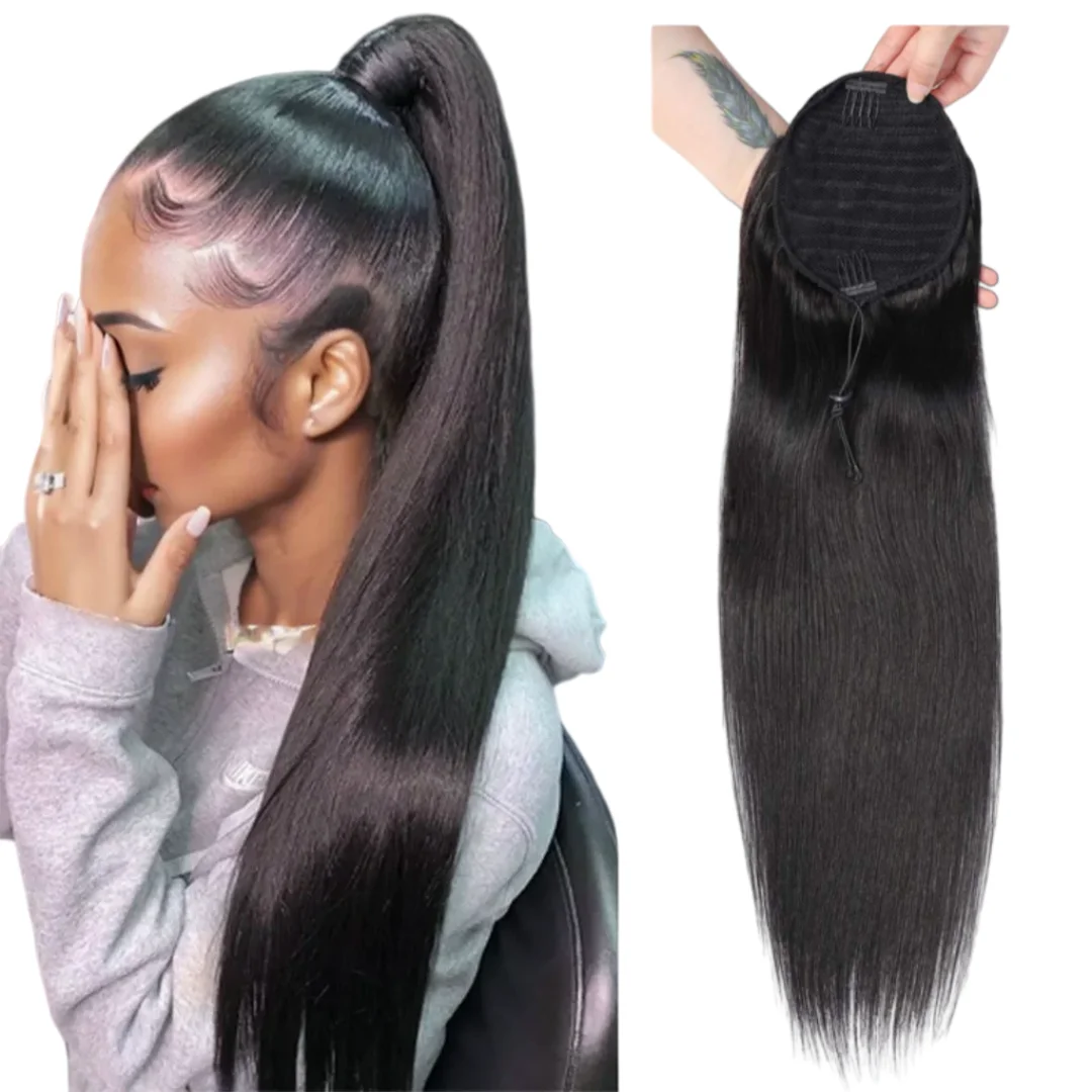Extension per Coda di Cavallo in Capelli Umani Lisci con Fascia Avvolgente, Coda di Cavallo Brasiliana in Capelli Umani Neri Naturali per Donne di Colore