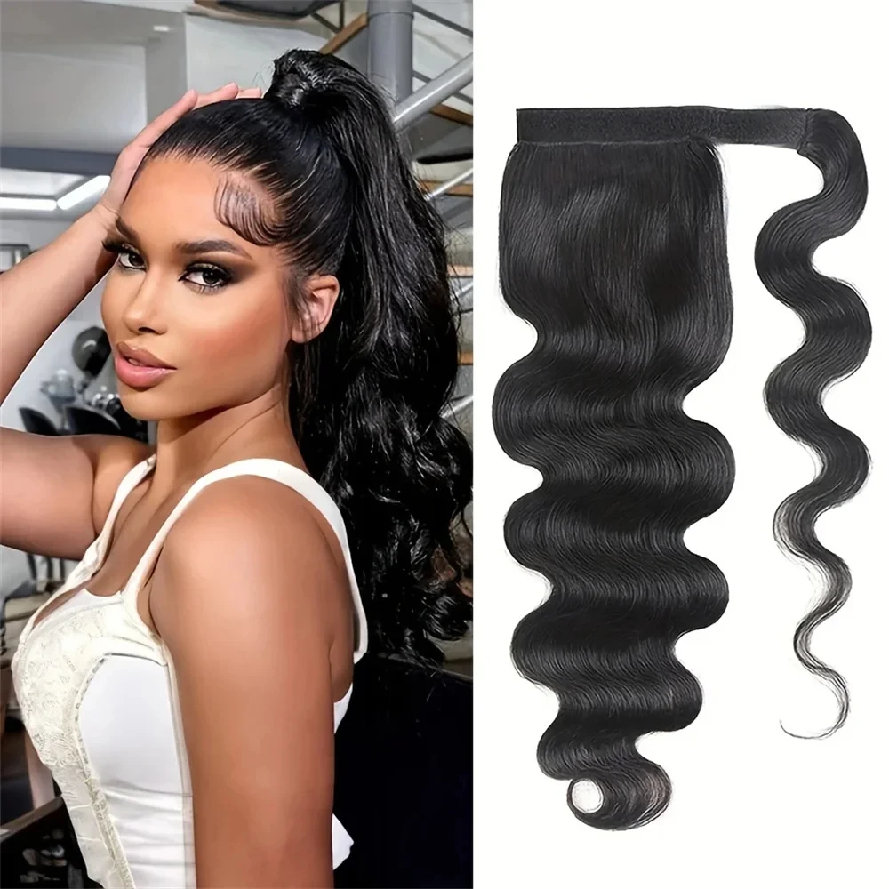Extension Coda di Cavallo Body Wave in Capelli Umani, con Clip Avvolgente, per Donna, Effetto Naturale