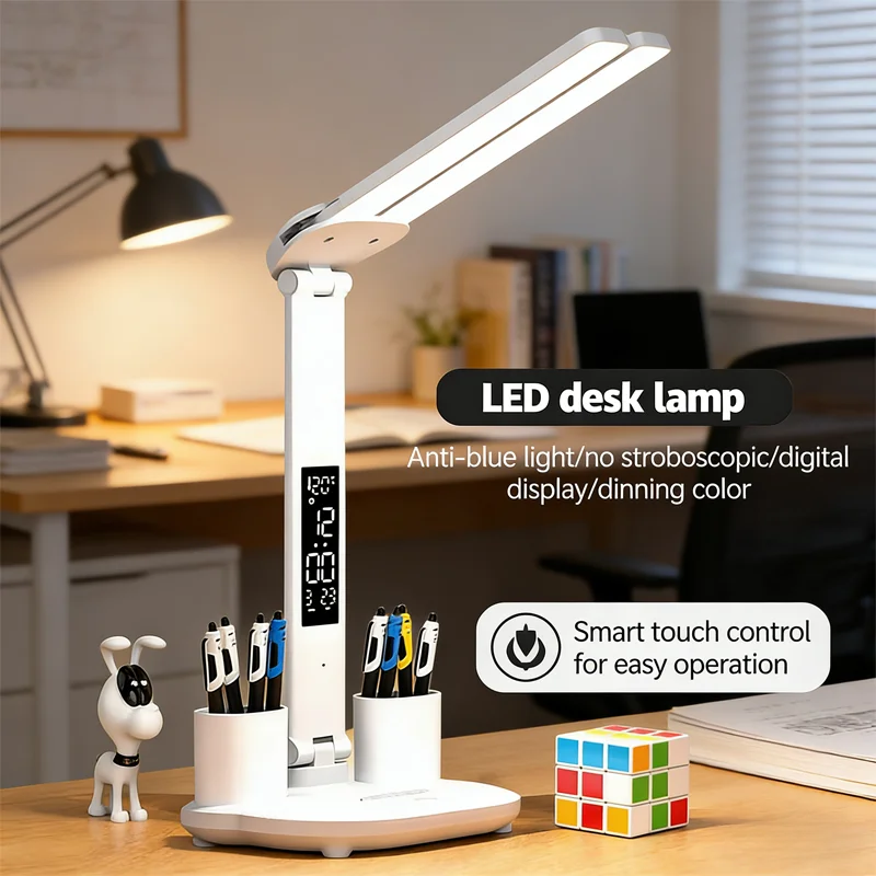 Lampada da scrivania pieghevole con dimmer touch, protezione per gli occhi, sveglia, termometro, luce notturna a LED ricaricabile USB