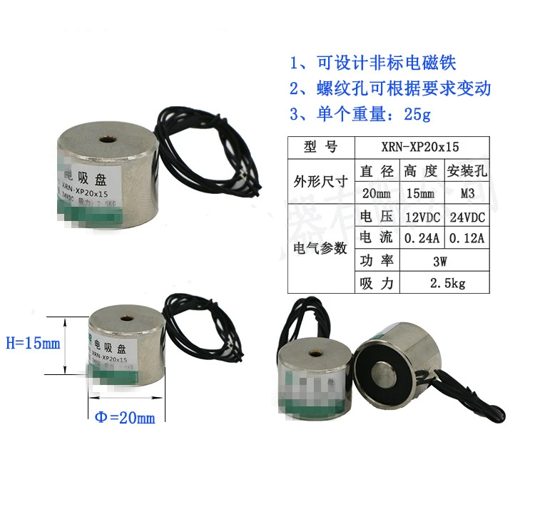 XRN-XP20x15 Elettromagnete a ventosa DC diametro 20 altezza 15mm aspirazione 2,5 kg DC 12V 0,24A DC 24V 0,12A 3W M3