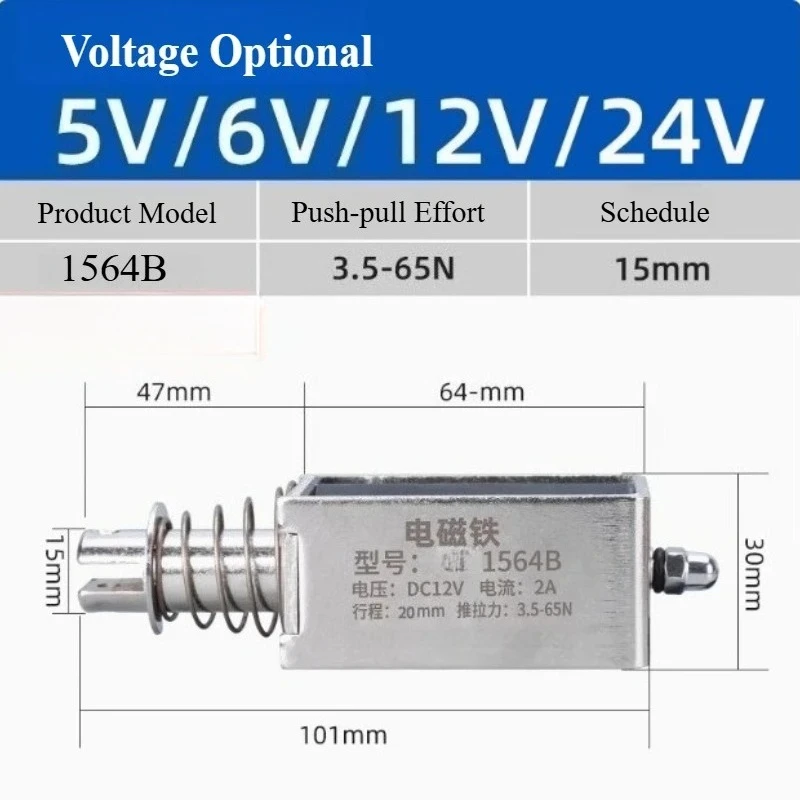 1564B 3.5-65N 15MM DC 5V6V12V24V Tipo push-pull Interruttore elettromagnetico lineare Elettromagnete a telaio aperto Corsa lunga industriale