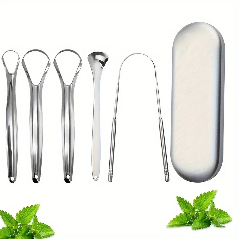 Set di raschietti per lingua in acciaio inossidabile da 4/5 pezzi, kit per l'igiene orale riutilizzabile portatile inodore per uomini e donne - Ideale per i viaggi per adulti
