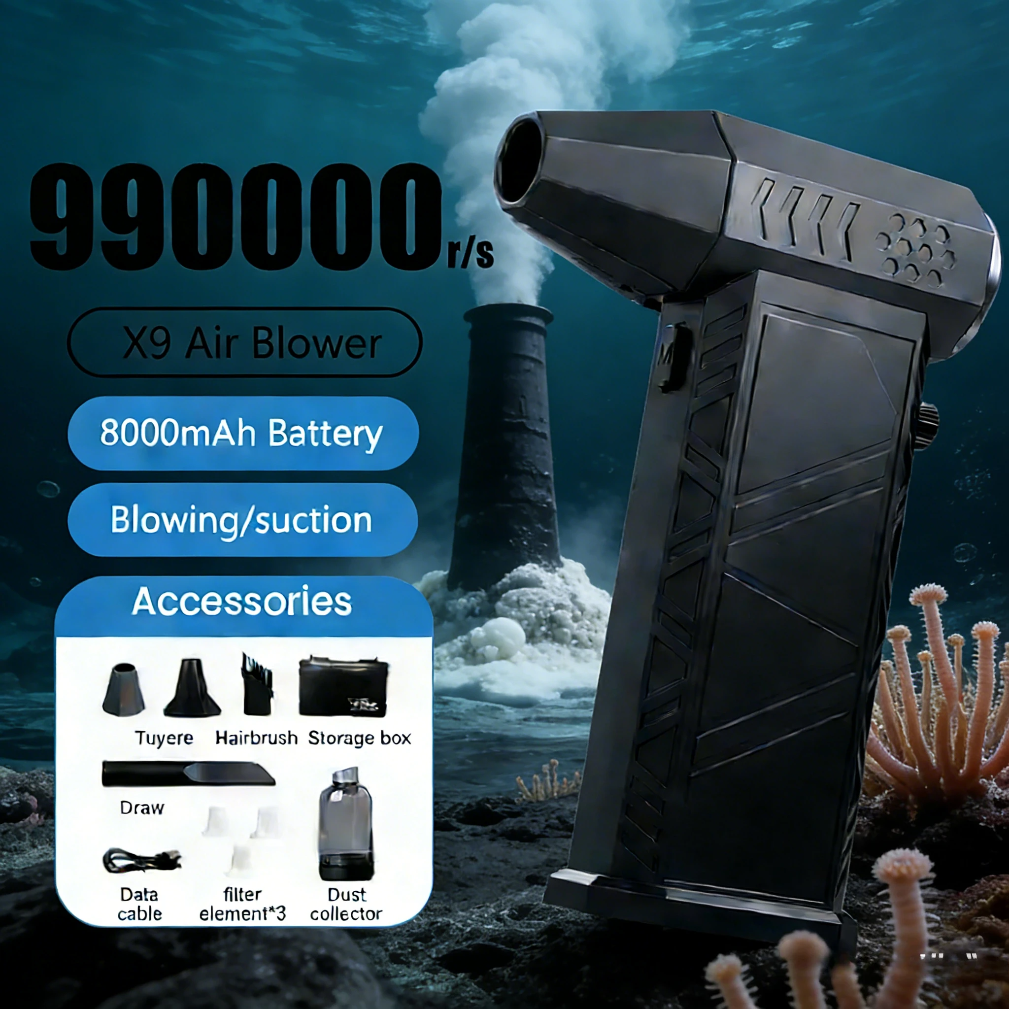 Soffiatore Multifunzione X9Pro+ con Motore Brushless da 990000 RPM, Velocità del Vento 58m/s, Aspirapolvere Portatile con Connessione Type-C